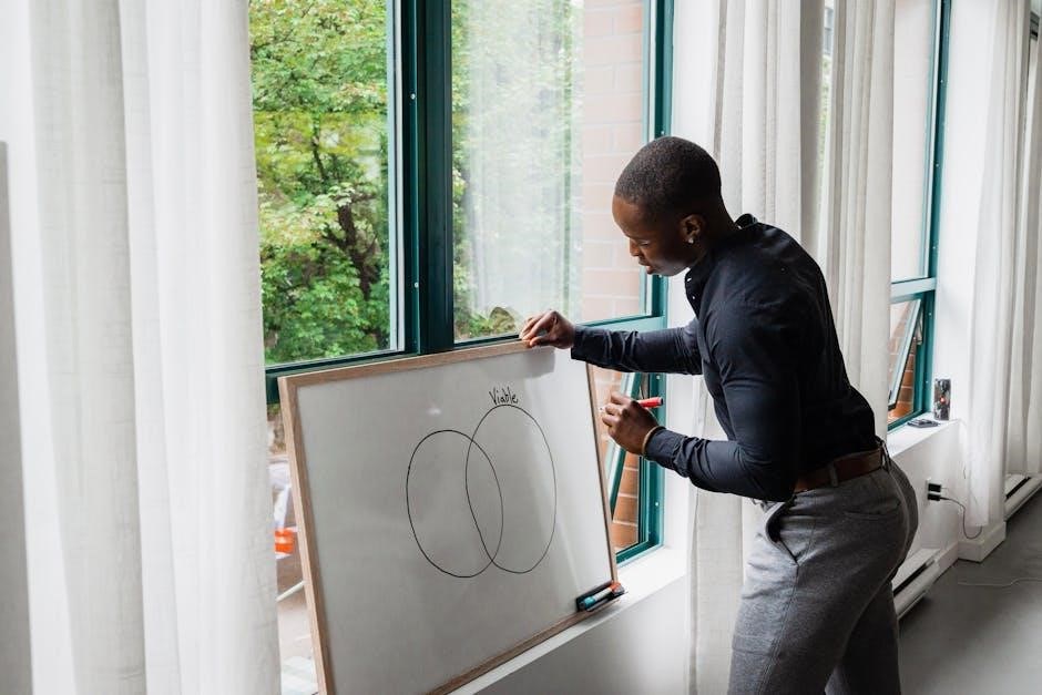 To create a Venn diagram, start by defining the topic or sets to compare․ Sketch two overlapping circles, ensuring the overlap represents shared characteristics․ Label each circle clearly․ Identify and list similarities in the overlapping section and differences in the non-overlapping areas․ Shade or color-code for clarity․ Add a title and instructions for users․ Review and ensure accuracy․ This method helps students visually organize information, making comparisons and contrasts easier to understand and analyze․
